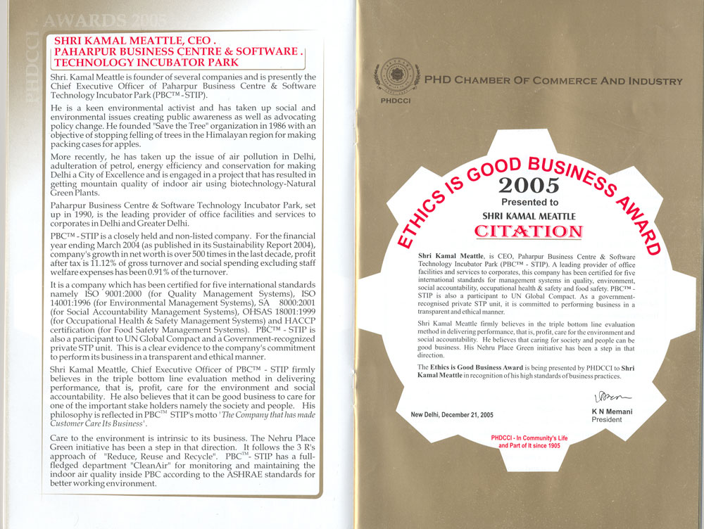 The Ethics is Good Business Award was presented to Kamal Meattle founder of several companies and presently the Chief Executive Officer of Paharpur Business Center & Software Technology Incubator Park (PBC-STIP).